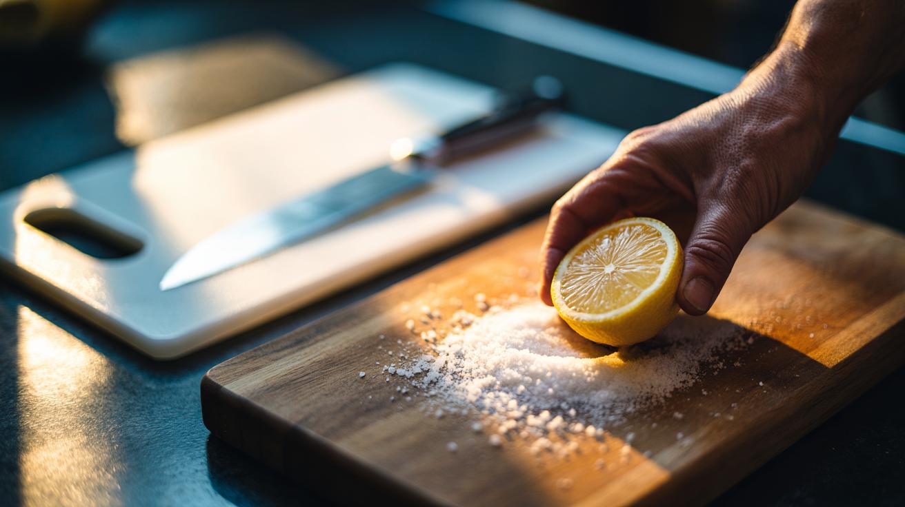 Start with a board that’s been scraped free of food scraps. Rinse quickly with warm water to dampen, then shake off excess. Scatter coarse salt—about one to two tablespoons for a medium board. The larger crystals matter: they bite into the surface without gouging and release brine as you rub. Using a clean sponge, cloth, or the cut face of half a lemon, scrub in small circles for 20–30 seconds, paying attention to grooves where knives have scored the surface.