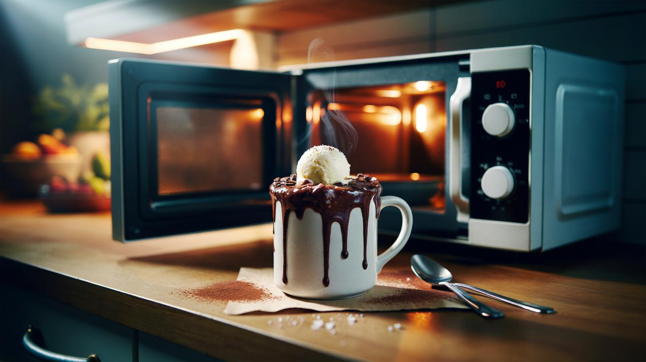 Serve with ice cream, custard, crème fraĂŽche, or berries. A drizzle of warm chocolate sauce turns it dinner-party worthy; a spoon of cherry jam makes a Black Forest nod. For sharing, split the batter into two small ramekins and cook 35â45 seconds each. If scaling up, cook one mug at a time for consistency. Never fill the mug more than halfwayâthe rise and bubble need space to prevent spills and ensure an even set.