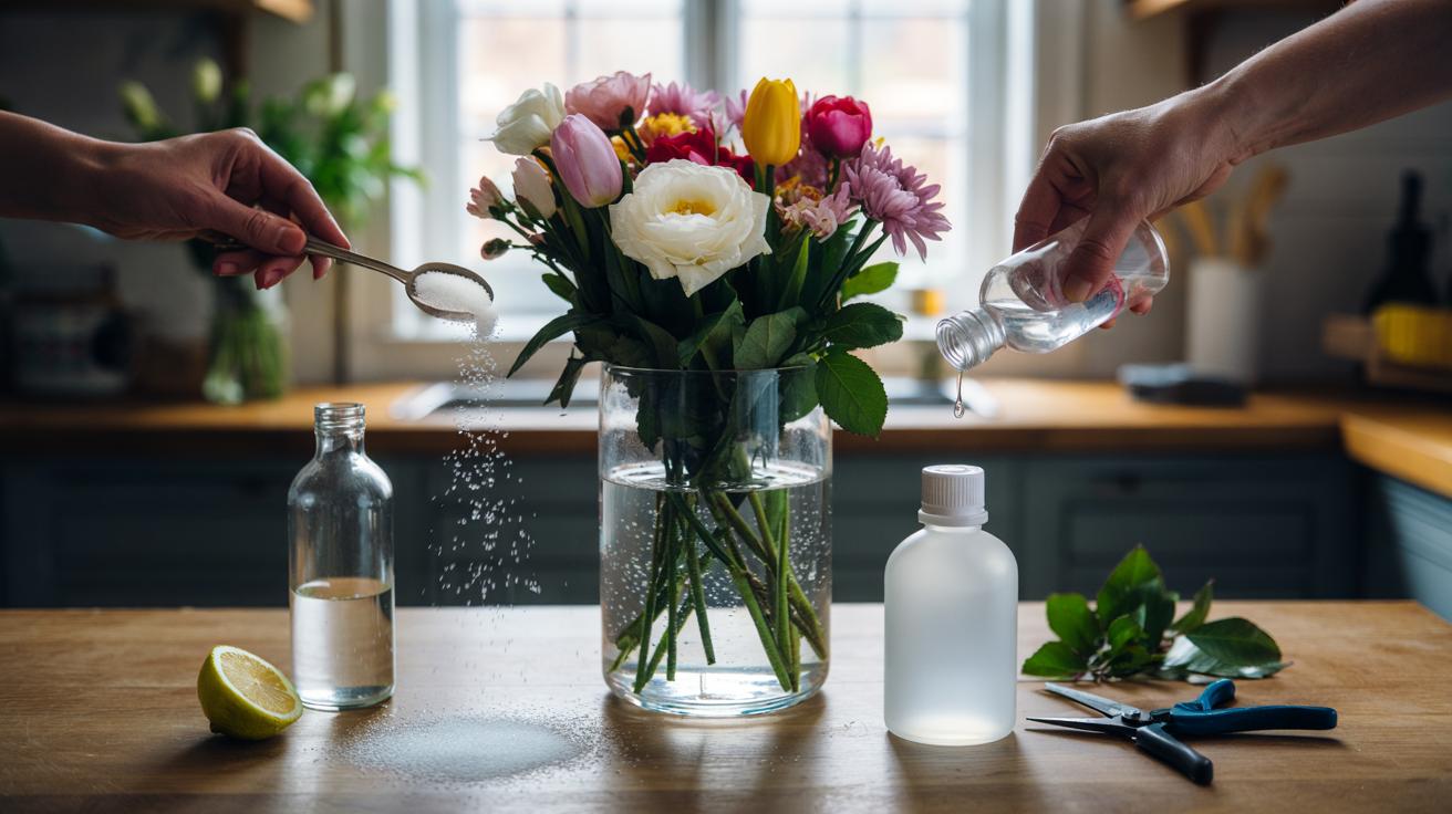 - 🧪 Proven home formula: per litre, 10–20 g sugar, 5 ml lemon (or 10 ml vinegar), and 2–3 drops unscented bleach; use lukewarm water (cool for bulbs), refresh every other day, and recut stems at 45°.