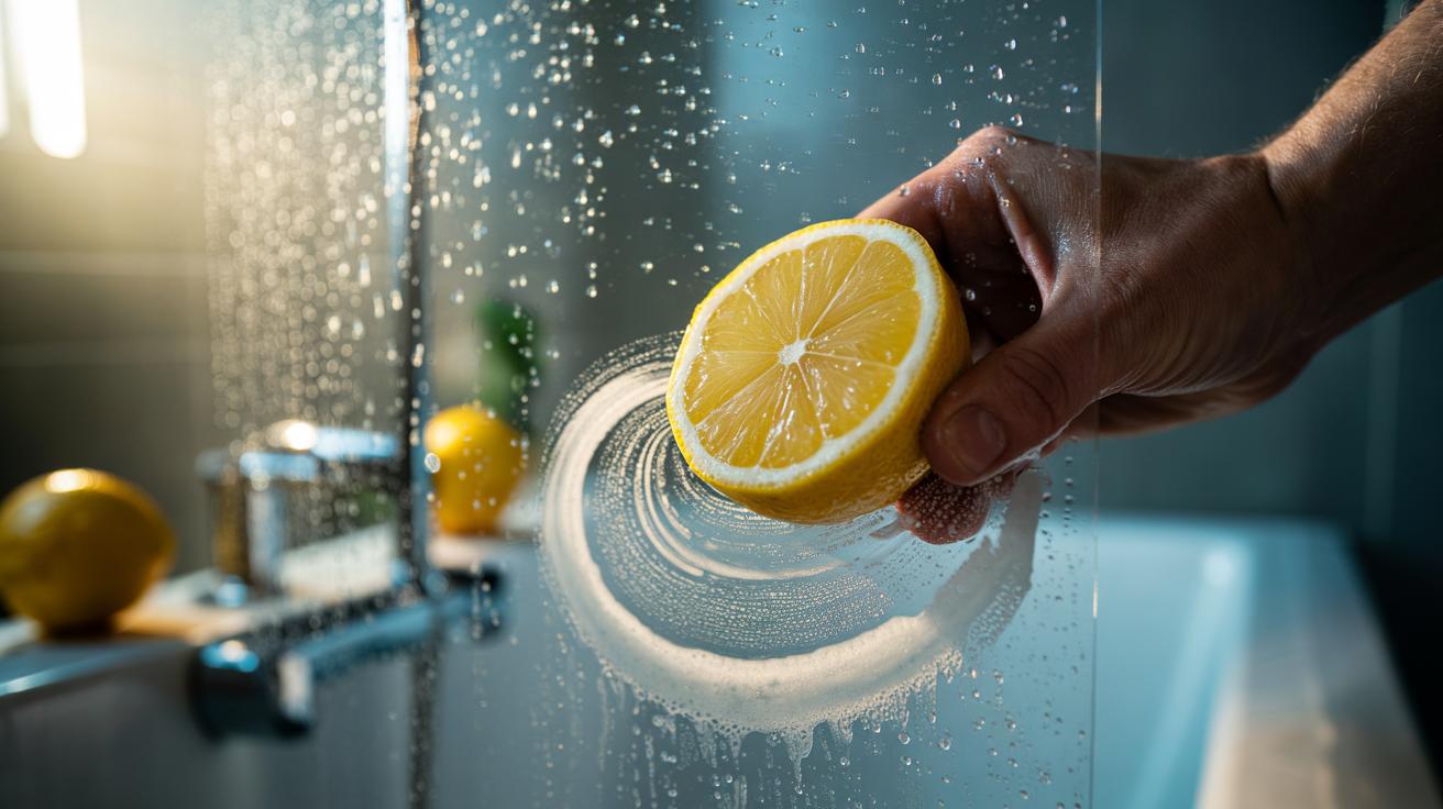- 🍋 Use a halved lemon to dissolve limescale and soap scum via citric acid, leaving glass crystal clear with a fresh scent.