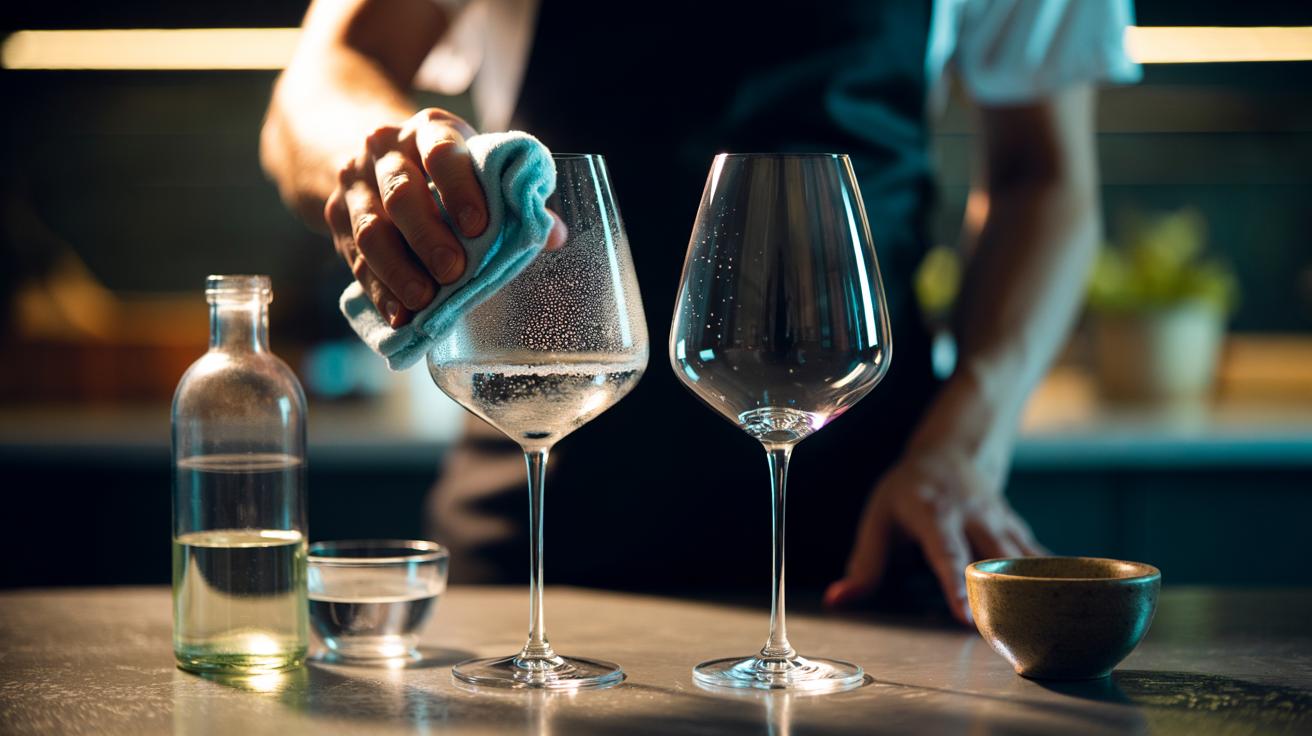 1) Prepare a 1:1 mix of warm water and white vinegar in a bowl or sink. For heavy scale, use vinegar neat. 2) Submerge glasses for 5–10 minutes, or wipe affected areas with a soft microfibre cloth soaked in the solution. A 30‑second wipe is often enough for fresh deposits. 3) Rinse thoroughly with clean water—ideally filtered or deionised to prevent new spots. 4) Dry immediately using a lint‑free towel, holding the bowl and stem separately to avoid torque.