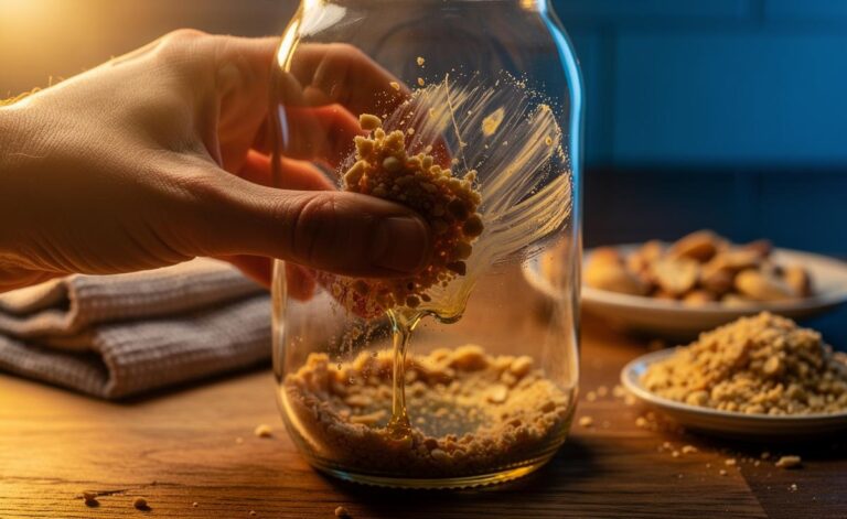 Illustration of [crushed peanuts being applied to sticker residue on a glass jar to dissolve the glue]